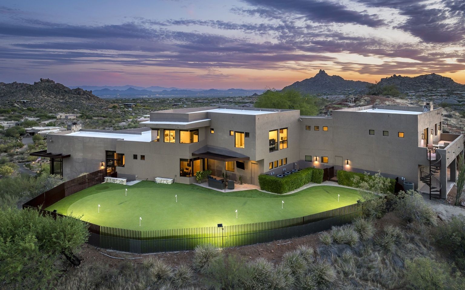 Your backyard is a golfer’s dream, a private golf complex with four greens, two bunkers, and six tee boxes, plus a Full Swing simulator and game lounge inside. After play, unwind by the pool and spa, gather by the firepits, or enjoy sweeping 360° views of Pinnacle Peak, Troon Mountain and the McDowells.